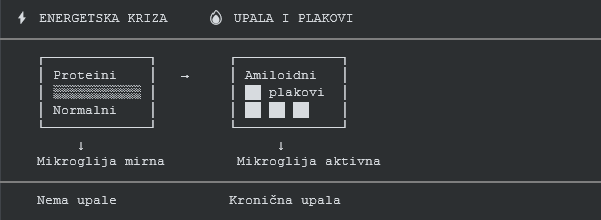 Kada stanicama nedostaje energije, proteini poput amiloidnog prekursorskog peptida (APP) počinju se nepravilno sklapati i stvaraju agregacije poznate kao plakovi. Istraživanje objavljeno u Cell (2020) pokazalo je da su ovi plakovi zapravo pokušaj mozga da se zaštiti od oksidativnog stresa, ali dugoročno postaju štetni.