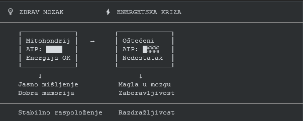 Glavni uzroci energetske krize uključuju reaktivne kisikove vrste (ROS) iz šećernih zamjena, kronični stres, onečišćenje i ultra-prerađenu hranu. Kada stanice mozga ne mogu proizvesti dovoljno energije, počinju se pojavljivati prvi simptomi: magla u mozgu, problemi s koncentracijom i promjene raspoloženja.